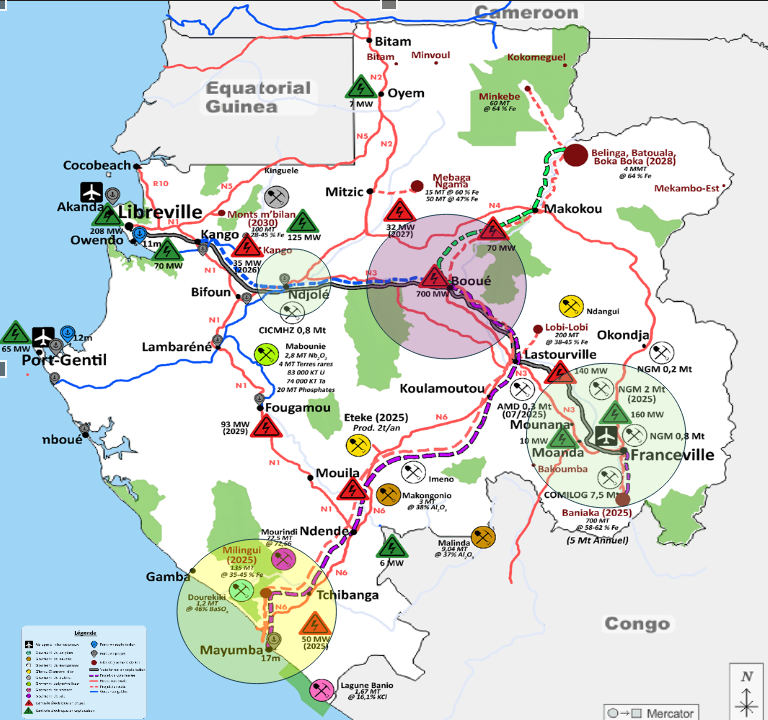 • Construire une ligne de chemin de fer stratégique reliant Bélinga à Booué, puis à Mayumba via Lastourville, pour relier les gisements stratégiques aux installations portuaires et permettre l’évacuation de la production, en tenant compte des gisements de Baniaka et Milingui